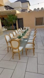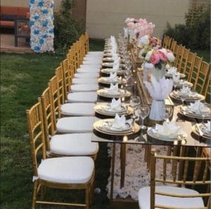 الأثاث الأنيق: تأجير الكراسي والطاولات يتيح لك توفير الكثير من الوقت والمال. يمكنك استئجار الطاولات، والكراسي، وأثاث الصالة الذي يتناسب مع تصميم الحفلة.